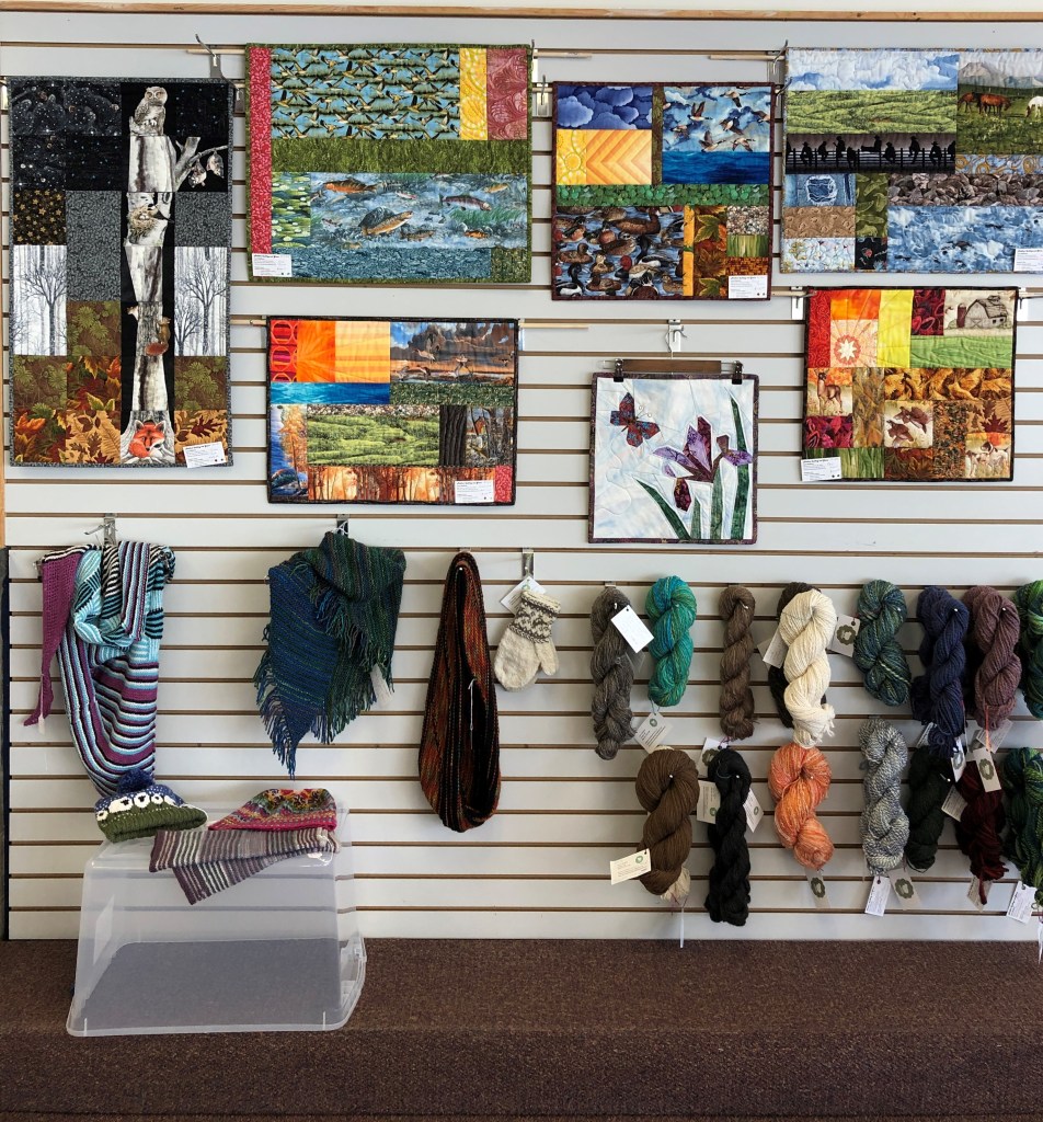 Recently, I opened my brick-and-mortar store. I had been running my longarm business out of my basement for years and now I am located at 128 West 2nd St in Chadron, Nebraska. After spending three weeks painting the walls from apple grren and brick red to cream, I opened with a quick Facebook post showing my art quilts, hand knitted items and homespun yarn.