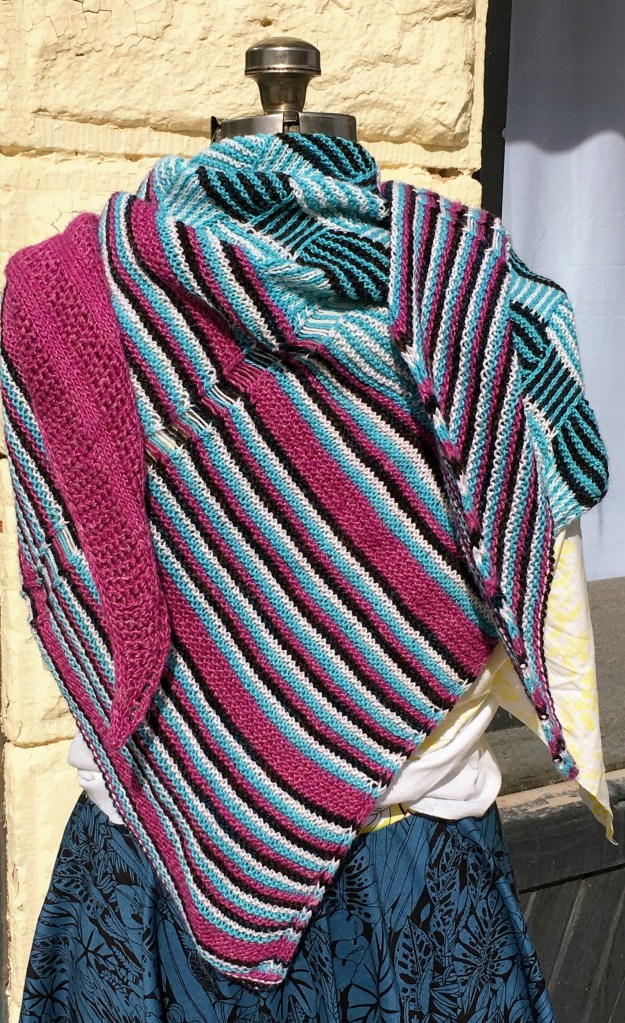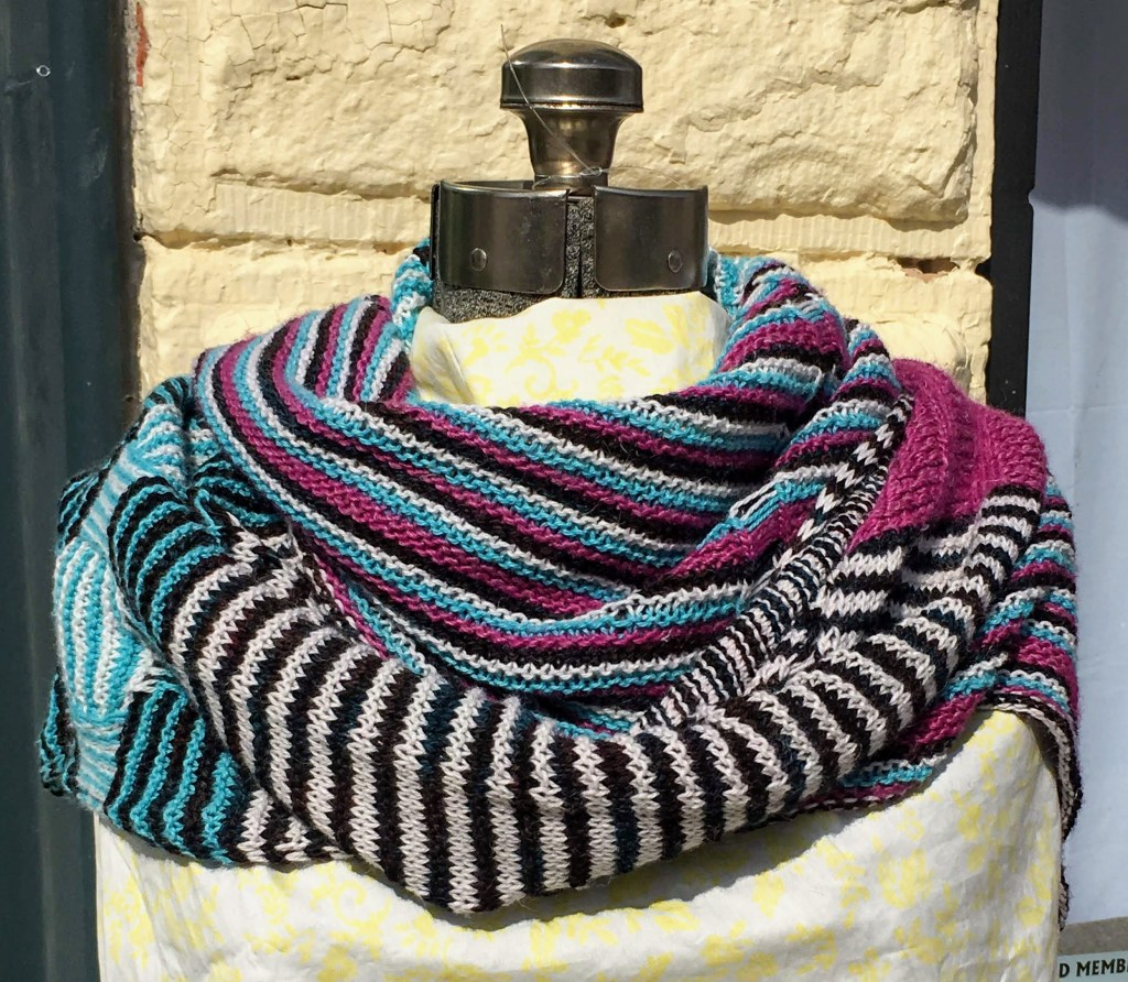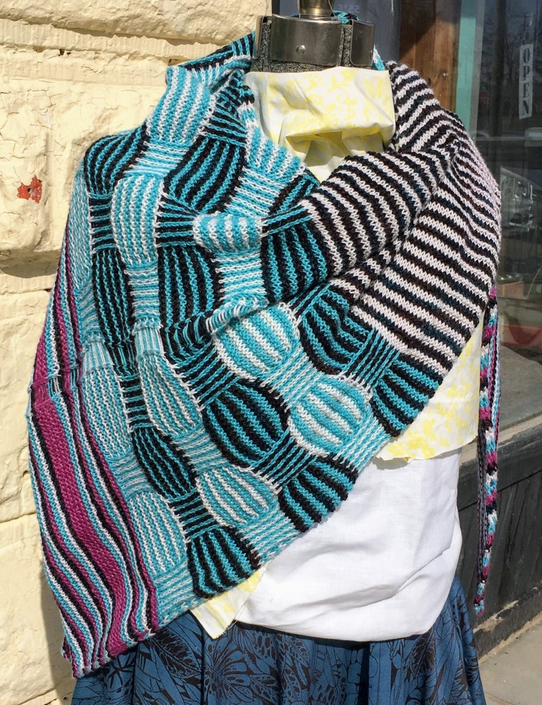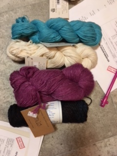 Weekly installment of a gumshoe murder mystery for 6 weeks. This was great fun. The first week we are introduced to the characters so we select our yarns. Next steps were knitting the four sections with dropped stitches, basket weave, illusion knitting, and modified lace We finish with an epilogue and identification of the murderer and a beautiful shawl. The turquoise and white yarns are an alpaca cotton blend. The purple is a wool linen blend and the black yarn is wool with hints of turquoise. if you are interested in this scarf, check out my online shop.